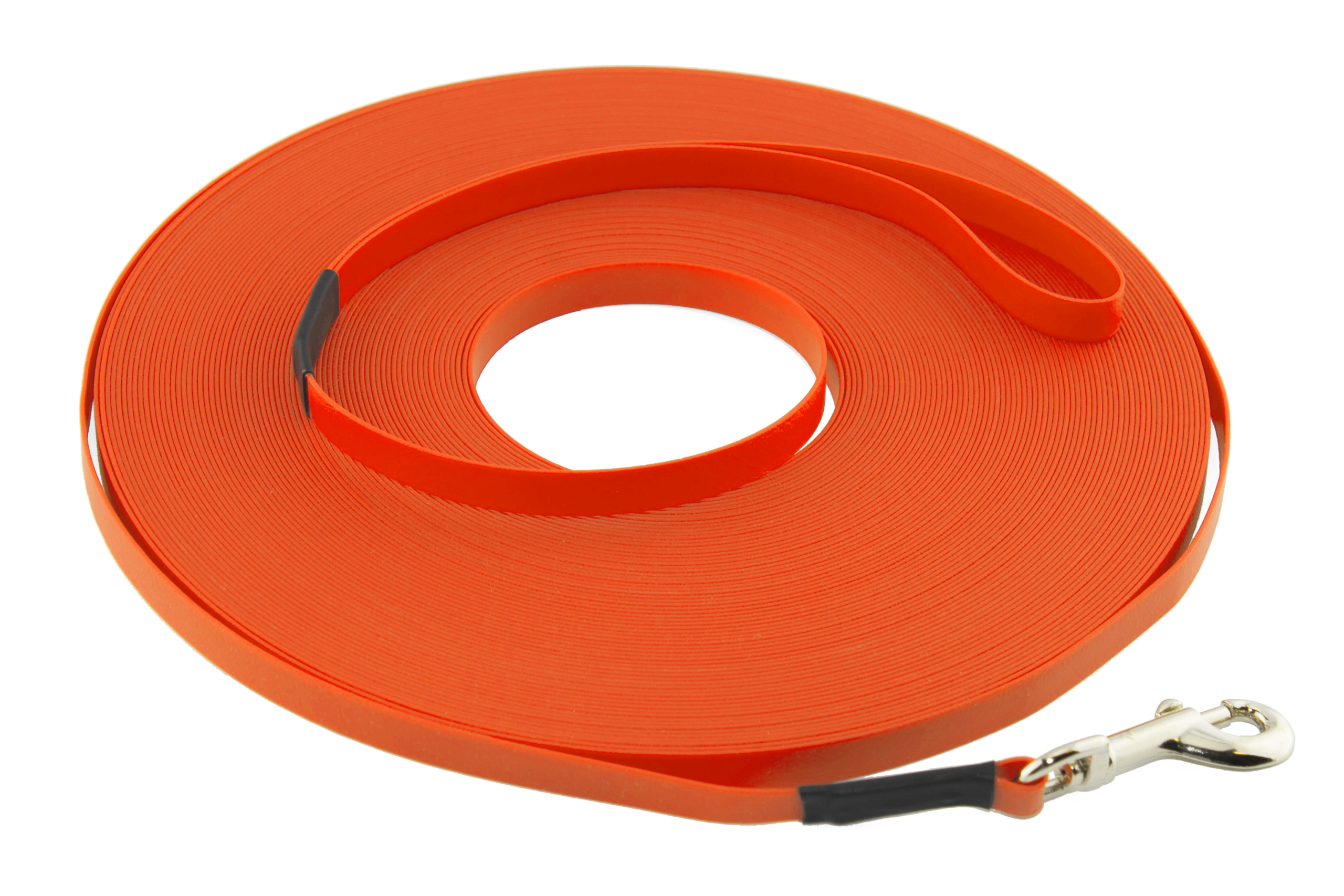 Hochwertige, handgefertigte BioThane® Schleppleine aus extra leichter Ultra Thin BioThane® in den Farben schwarz, neon-orange und rot. Mit einer Breite von nur 9 mm bestens für sehr kleine Hunde, Welpen und Katzen bis maximal 5 kg geeignet. Die verwendete Ultra Thin BioThane® ist nur ca. 1 mm dick und wiegt pro Meter nur ca. 10 g, wodurch sie bestens für die Kleinsten der Kleinen geeignet ist.