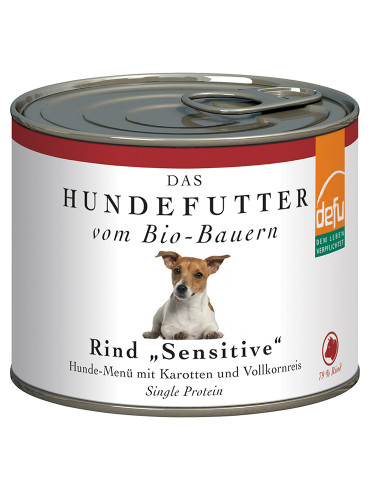 Unser Hunde-Menü „Rind Sensitive “ ist eine schmackhafte Komposition aus 79 % Bio-Rind, gesundem Fenchel, vitaminreichen Karotten und kräftigem Vollkornreis. Da es nur eine einzige Proteinquelle enthält, ist es ideal geeignet als tägliches Futter für sensible Hunde, die zu Allergien neigen.